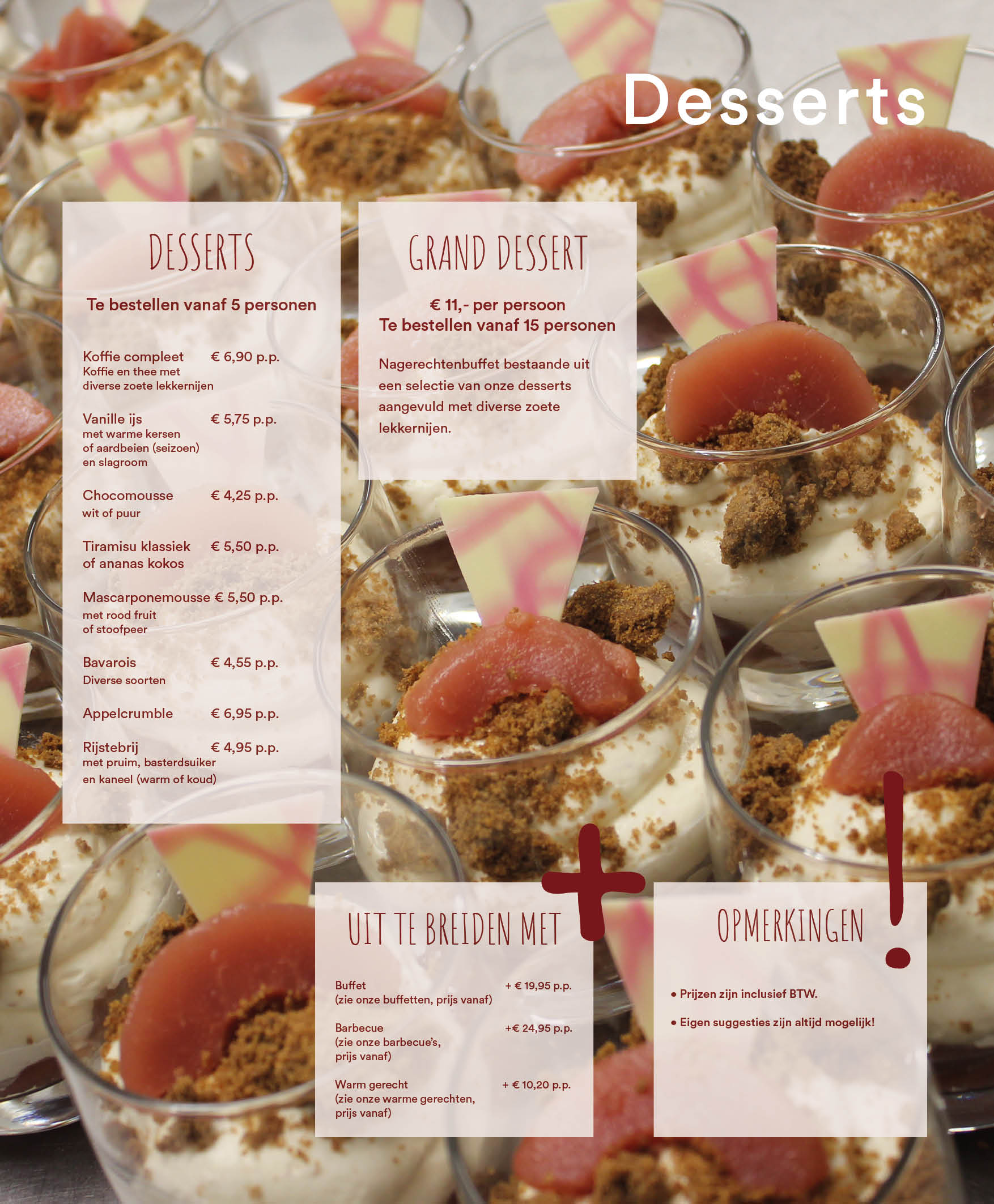 We hebben voor ieders wens een menu samengesteld, welke hieronder weergegeven staan. Onze prijzen zijn inclusief BTW.